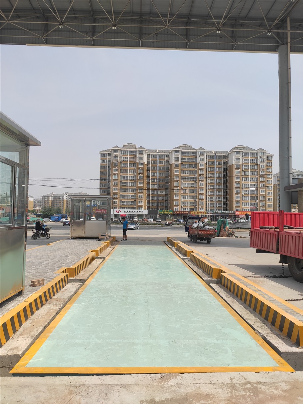 采購背景:安陽豫北蔬菜批發(fā)市場位于安陽市文峰區(qū)S301(舊)與京港澳高速交叉路口往東約100米(鴻泰苑西南側(cè)約50米),是一家以蔬菜交易為主,副食品、瓜果、農(nóng)藥、農(nóng)膜等農(nóng)資產(chǎn)品為輔、批零兼營、品種豐富的大型綜合批發(fā)交易市場。大量蔬菜及農(nóng)副食品進出市場需要計量稱重,對比多家地磅廠地磅后,訂購了2臺中原恒瑞地磅廠3x18m定額100噸電子汽車衡,地磅安裝于批發(fā)市場大門處,實現(xiàn)了貨車一進一出雙向進出計量稱重,現(xiàn)電子汽車衡已安裝到位并投入使用。